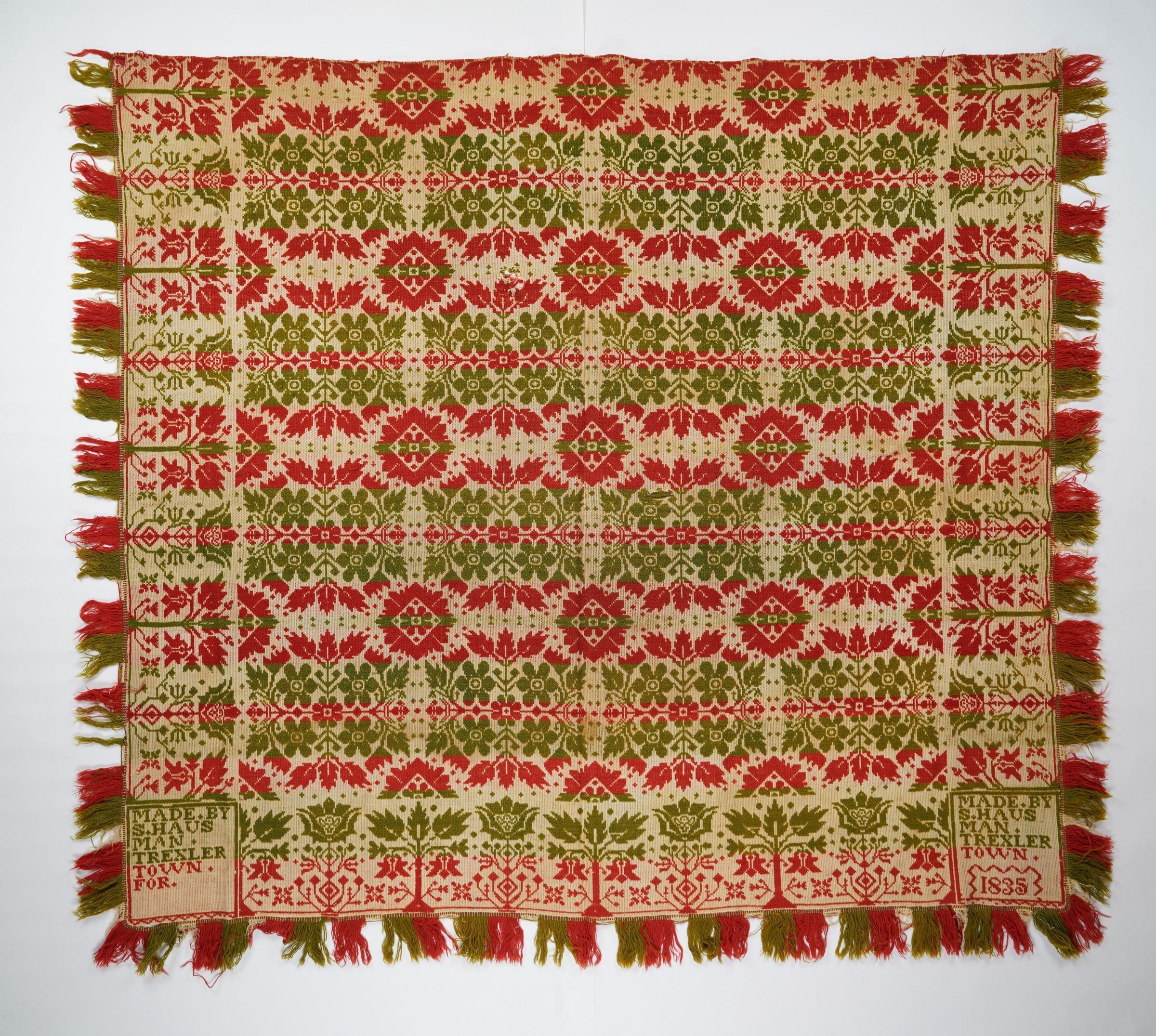 Red, green, and natural figured tied half doublecloth coverlet with border and applied fringe on three sides . Seamless. Woven by Solomon Hausman in Trexlertown, Upper Macungie Twp., Lehigh Co., Pennsylvania in 1836.Collection