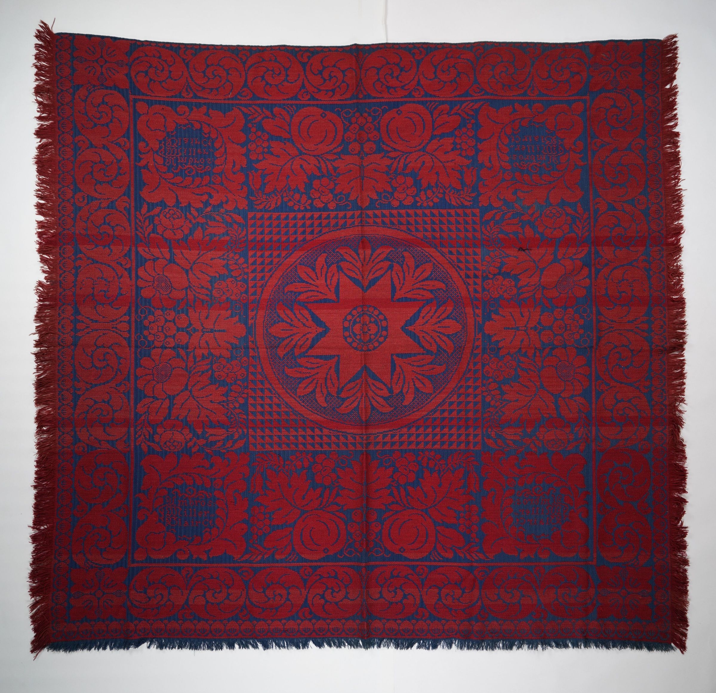 Red and navy figured tied half doublecloth coverlet with border and self-fringe on three sides. Seamless. Woven by Ambros/Umbros Miller in Blair Co., Pennsylvania.Collection