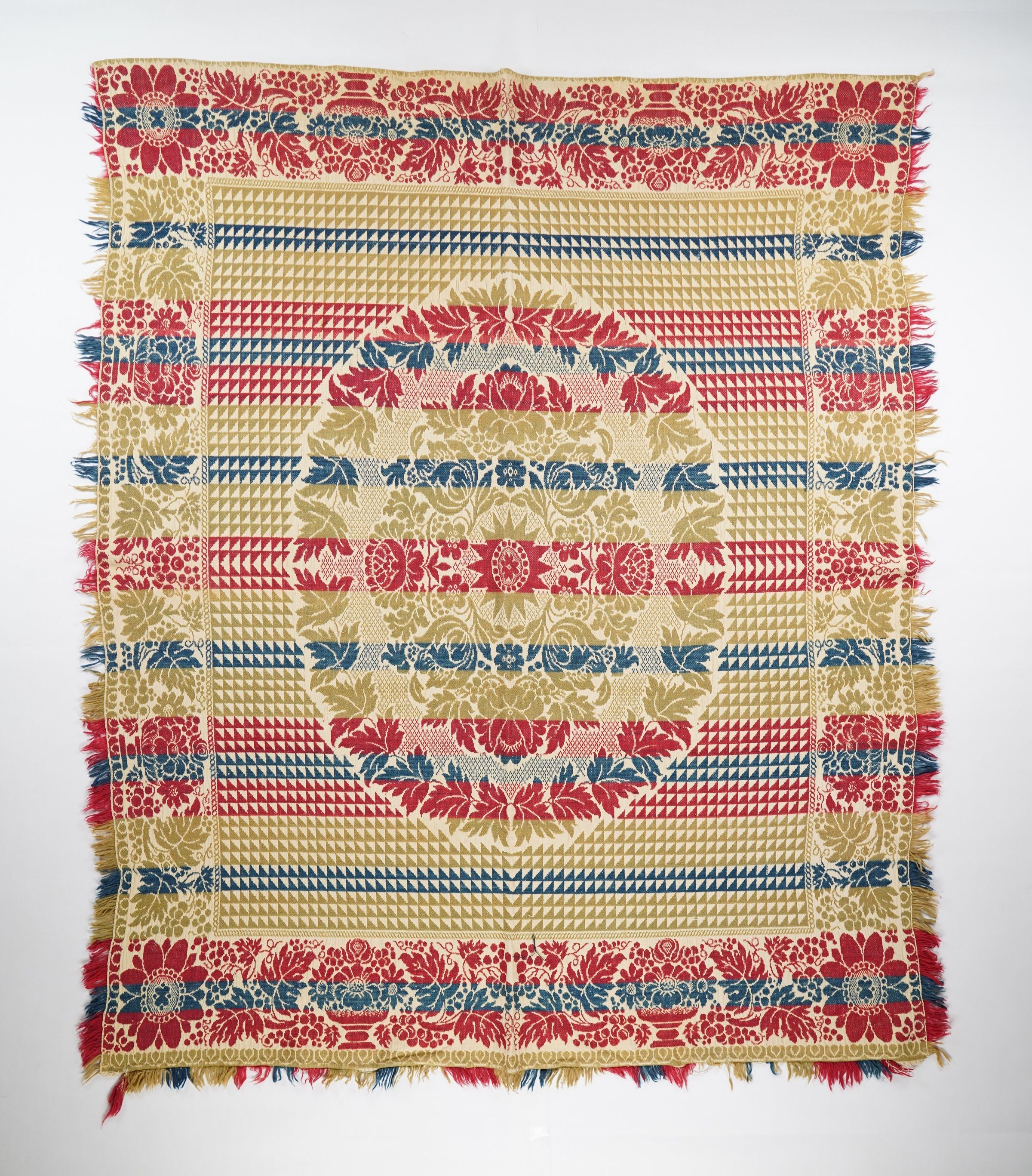 Figured and fancy doubleweave power woven coverlet with borders on 4 sides and self-fringe on the sides and bottom. Woven full-width; seamless. Navy, red, and light green wool with undyed cotton. Center medallion centerfield pattern; grapevine border on all sides. Unknown weaver.Context