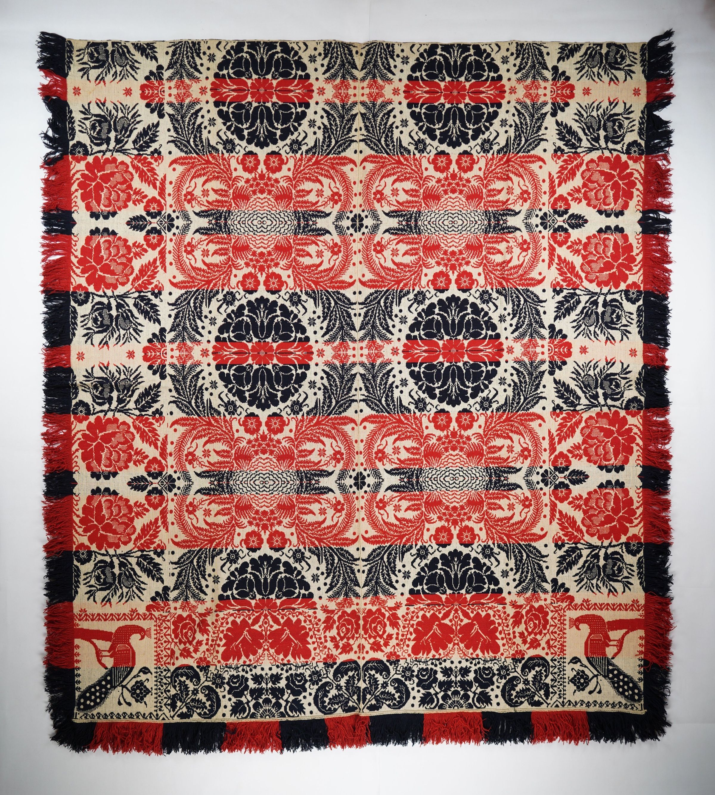 Figured tied beiderwand coverlet with borders on three sides; self-fringe on sides and applied fringe on bottom. Two panels joined by a center seam. Navy and red wool with undyed cotton. Floral tulip medallions and leaf fronds centerfield pattern; large rose border on sides; leafy border on bottom. Unknown weaver with peacock cornerblock.Context