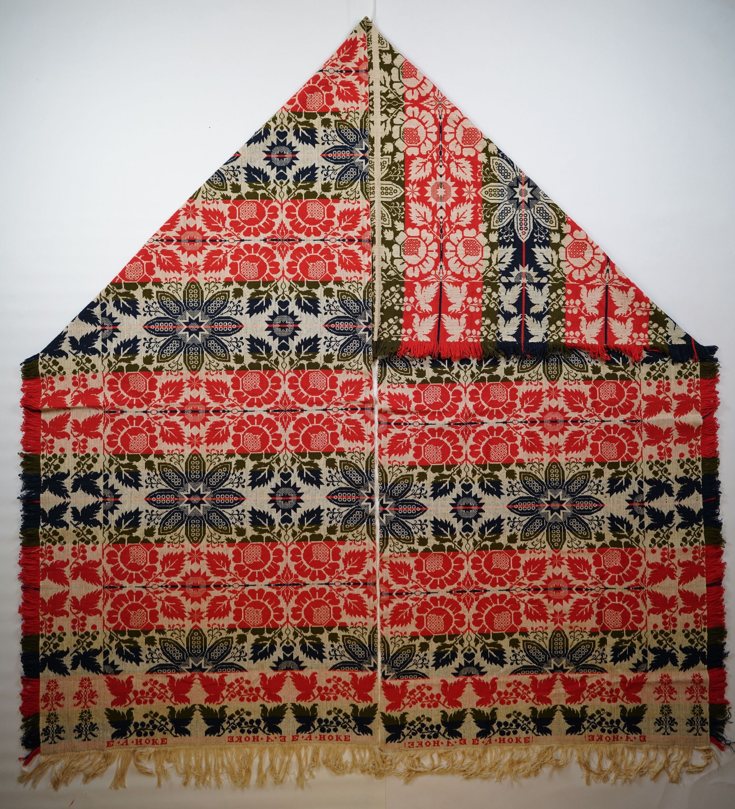 Green, red, navy, and natural figured tied half doublecloth coverlet with border and self-fringe. One, uncut panel. In the image, the coverlet is folded into an upside down "v" shape. Woven in Pennsylvania for E.A. Hoke.Collection