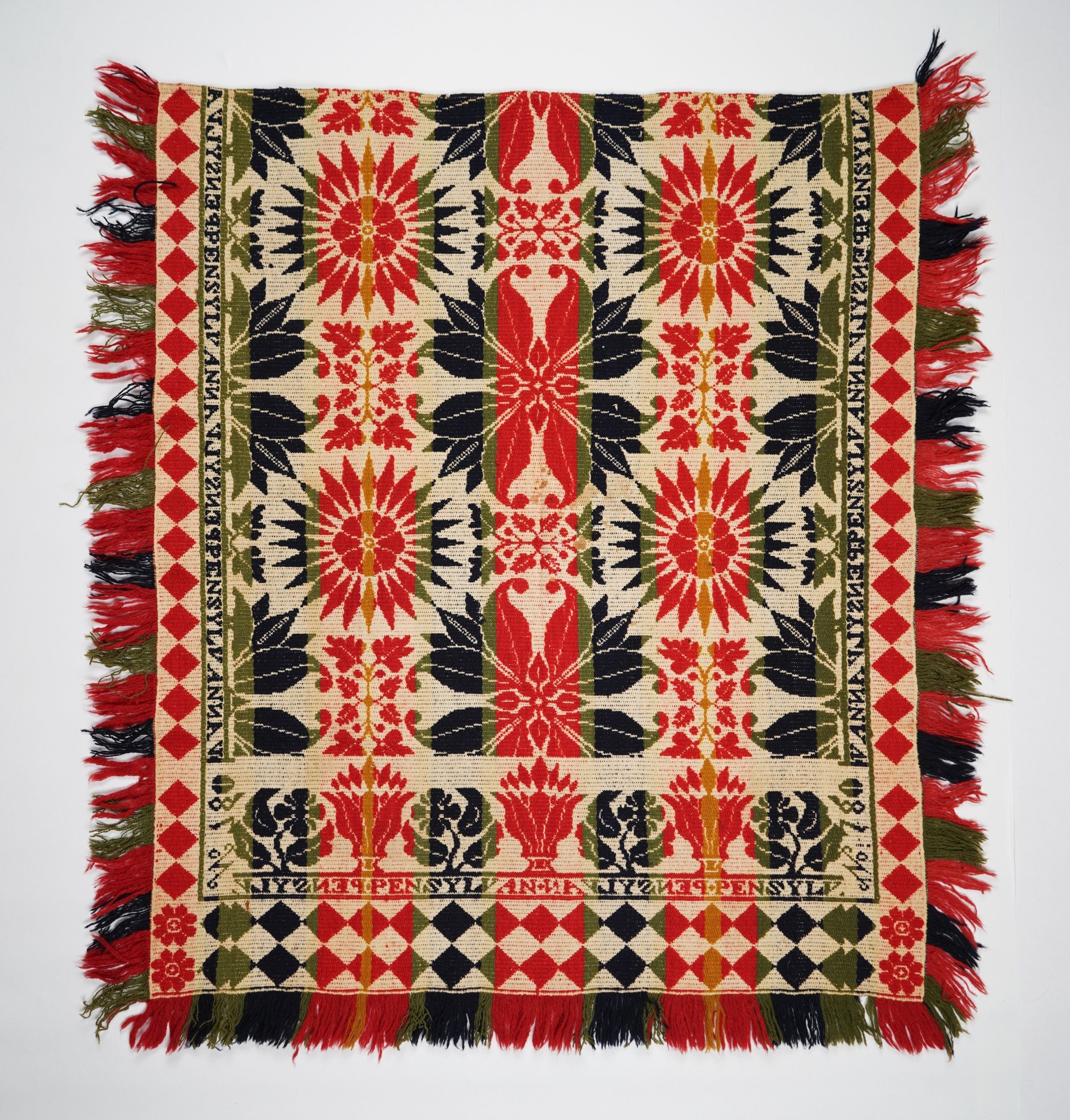 Red, green, navy, and natural figured tied half doublecloth crib coverlet with border and fringe on three sides. Numbered 780.Collection