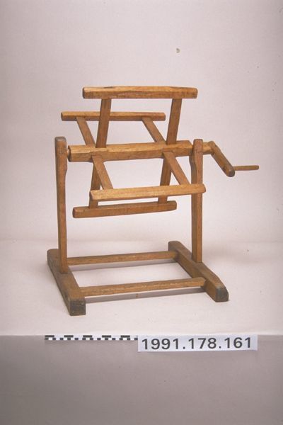 Reel; wrap, 4 arm, wood. A rectangular base has two parallel upright support posts set into it. An axle with a handle fits into one post and the notch at the top of the other post. Four double arms with connecting bars fit through the sides of the axle.Collection