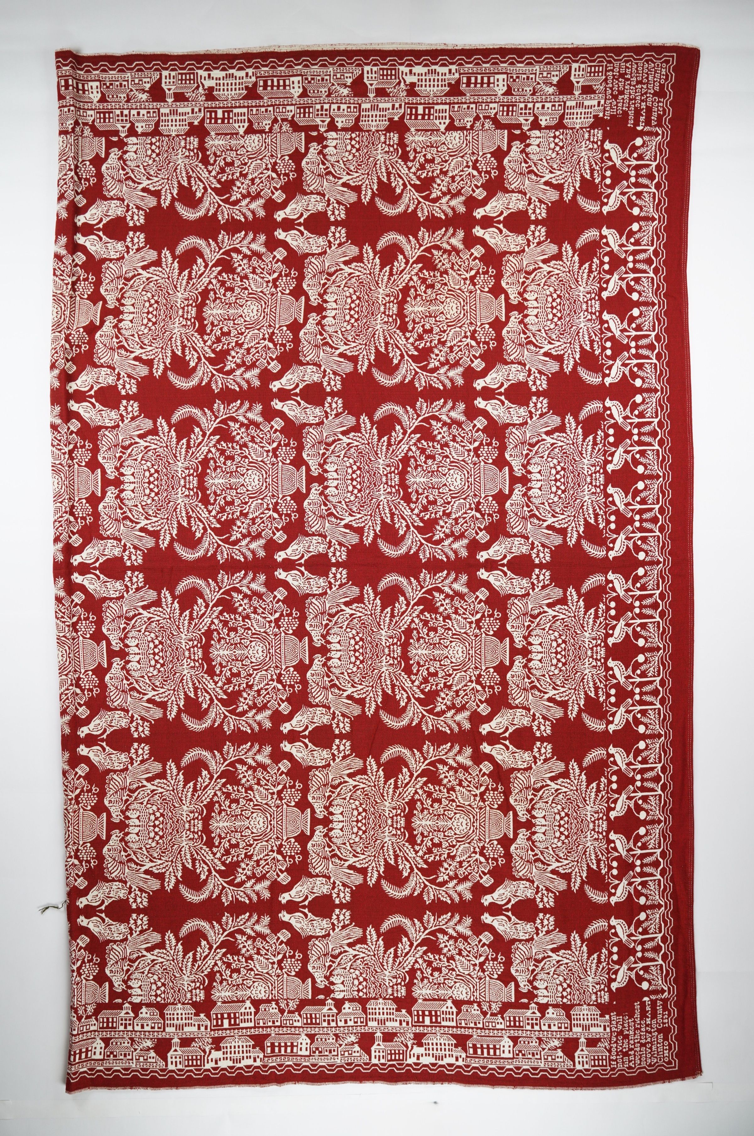 Reproduction red and natural figured doubleweave coverlet with border on three sides. Seamless. Reproduces a coverlet pattern wove by Jesse Hart in 1851 in Wilmington, Union Twp., Clinton Co., Ohio. Inscribed is "If good we plant not, vice will fill the place and rankest weeds the richest soils deface," based on a quote of Plutarch: "The richest soil, if uncultivated, produces the rankest weeds."Context
