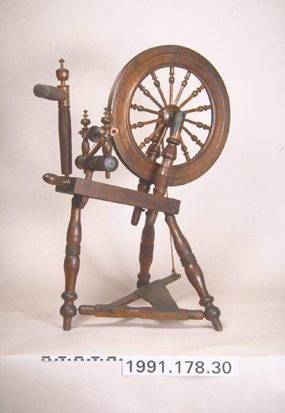 Spinning wheel; horizontal, bobbin/flyer, treadle. Slanted rectangular table rests on three splayed legs. The treadle fits into a pivoting bar between two legs. A cord footman connects the treadle to the drive wheel axle. Two slanted wheel posts fits through the table, secured by pins. (Front post pin not present.) The drive wheel axle rests in slots in the wheel posts, secured by a pin in the rear post. The drive wheel has fourteen spokes; the rim, with two grooves, is constructed in four sections. The mother-of-all support post fits through the table. The maidens are vertical, fitting through the table. The bobbin/flyer is complete and designed for a doubled drive-band. The tensioning screw passes through the table end. Distaff arm and holder fits into table behind the mother-of-all. Turnings on legs, posts, spokes, maidens, distaff post and arms- (Sheraton period)Collection