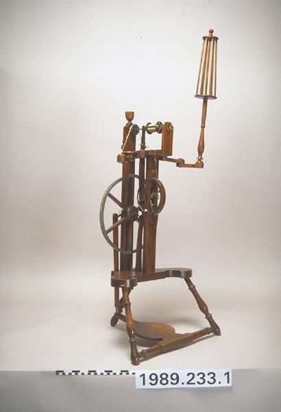 Spinning wheel; vertical, bobbin/ flyer, treadle. Bracket-shaped table is supported by thee splayed legs. Two-part treadle is connected to the drive wheel by the footman. Spinning mechanism is supported by two vertical members. The rear vertical supports the footman and drive wheel and has a small cup with an ivory rim at top. The rear vertical also has a small turned knob with a hole through it. Inserted into the hole is a small reeling peg. The front vertical is shorter than the real vertical and supports a horizontal piece to which the distaff and water bowl are connected; it also holds the secondary wheel and cam; the horizontal piece holds the front support for the bobbin and spindle. The third vertical is connected by a spring to the rear vertical and moves the bobbin back and forth. Drive wheel has lead rim and six squared wooden spokes. Umbrella-style distaff is set in articulated arm at right; small water bowl is set in articulated arm at left. Secondary wheel is brass and has heart-shaped cam which moves bobbin back and forth on spindle so that yarn is wound evenly on bobbin. Turnings on legs.Collection