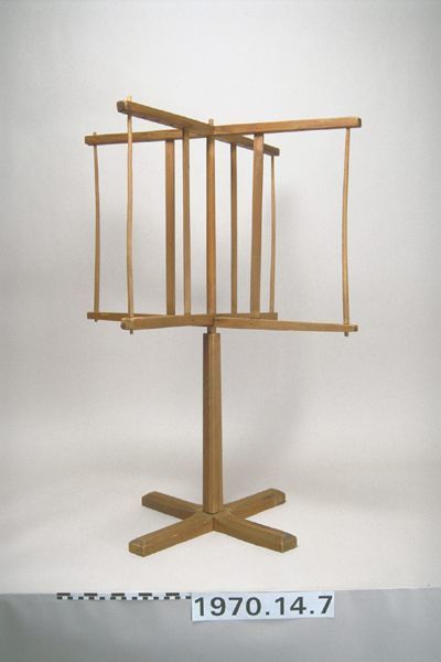 Swift; cross frame, wood. Two interlocking blocks of wood fitted at right angles form a base, with a central post set into it. Two parallel, horizontal sets of four arms, at right angles,fit onto top section of post. They are connected by a fixed slat at the center of each arm. A removable dowel is at the end of each arm and can be changed from one hole to another, to accommodate different size skeins.Collection
