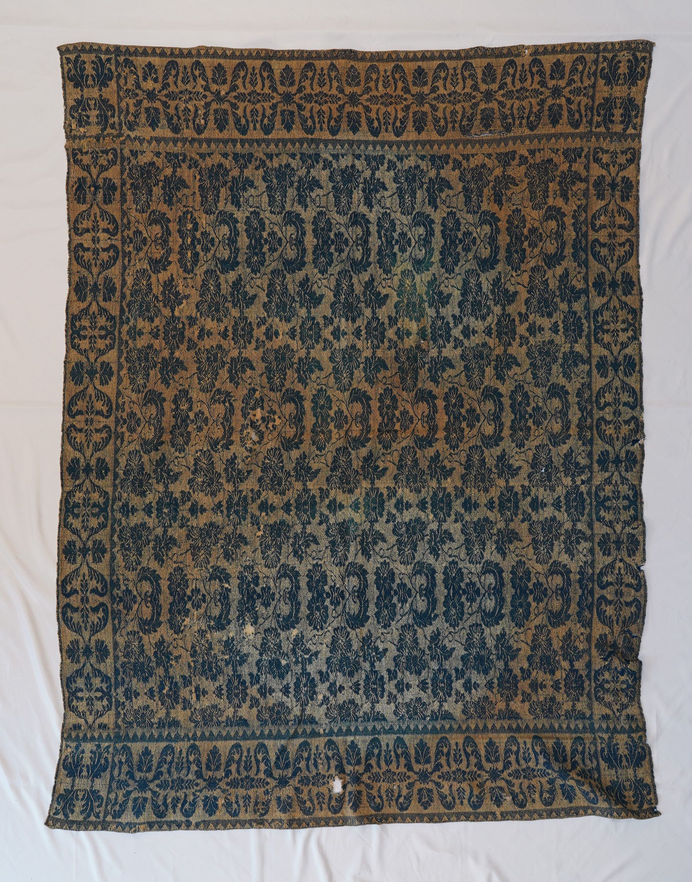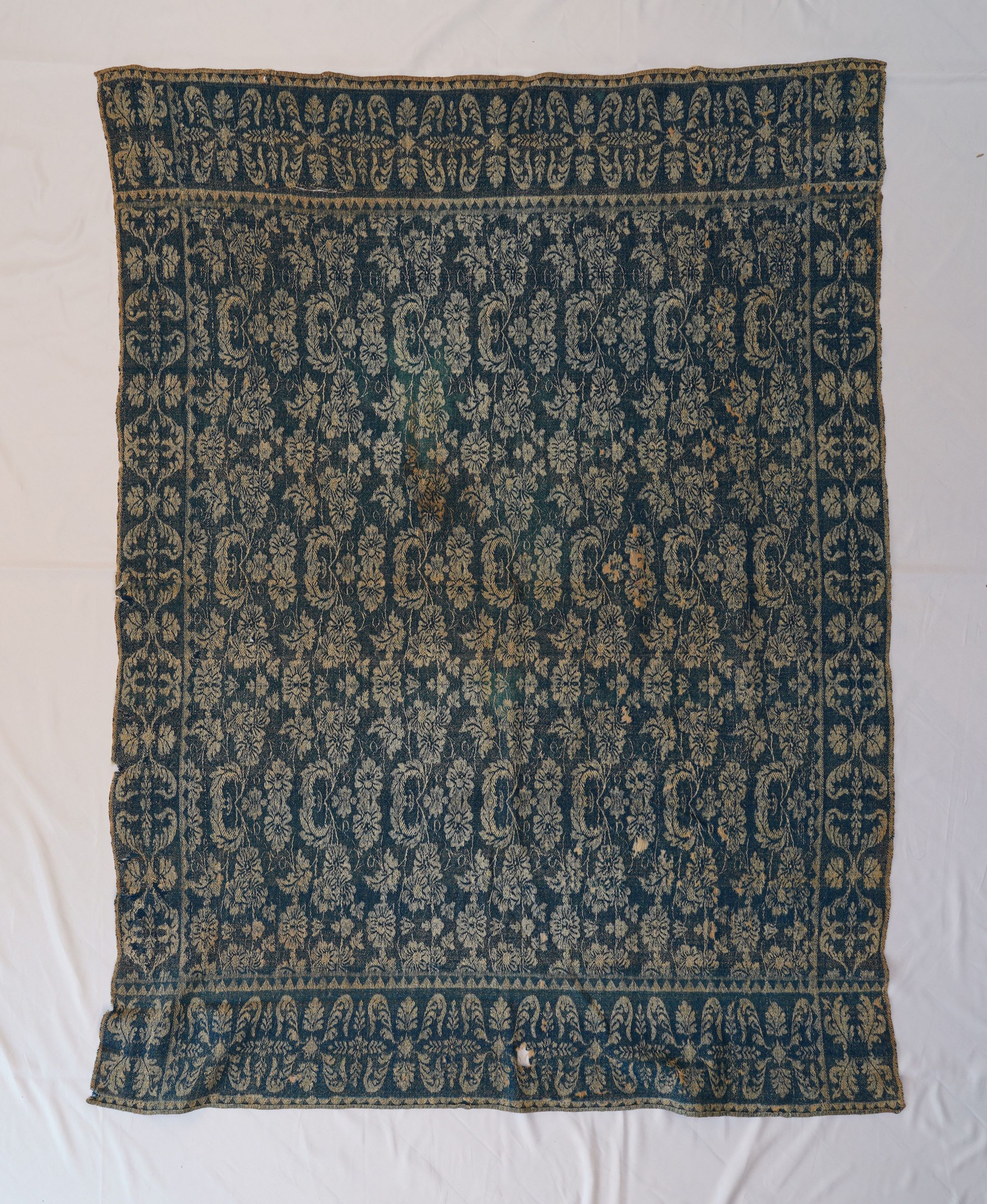 Navy and natural figured damask tablecloth; seamless. Border on four sides, no fringe.