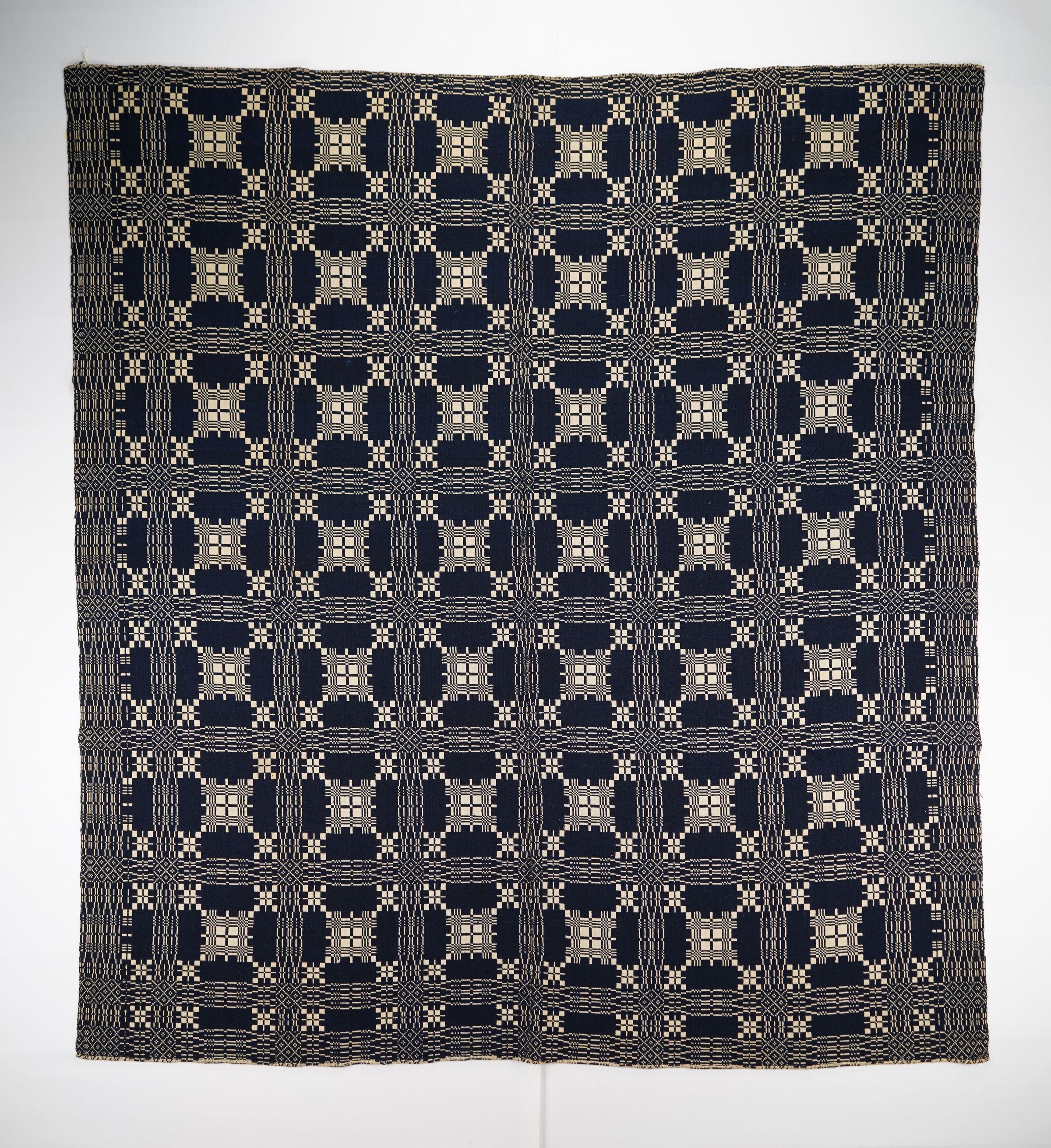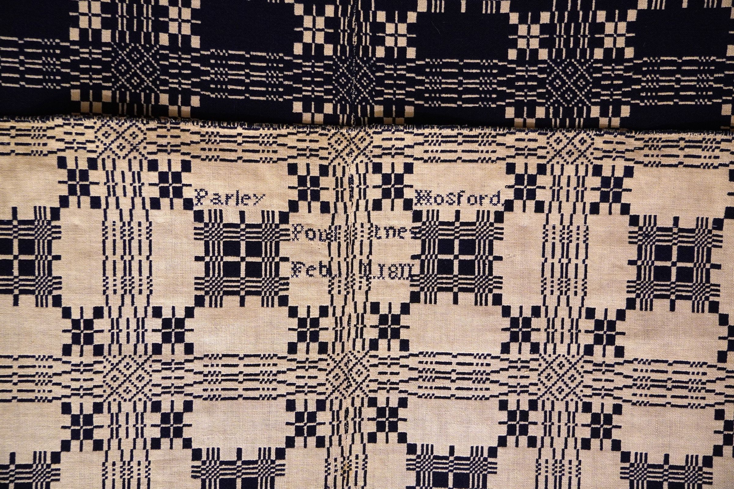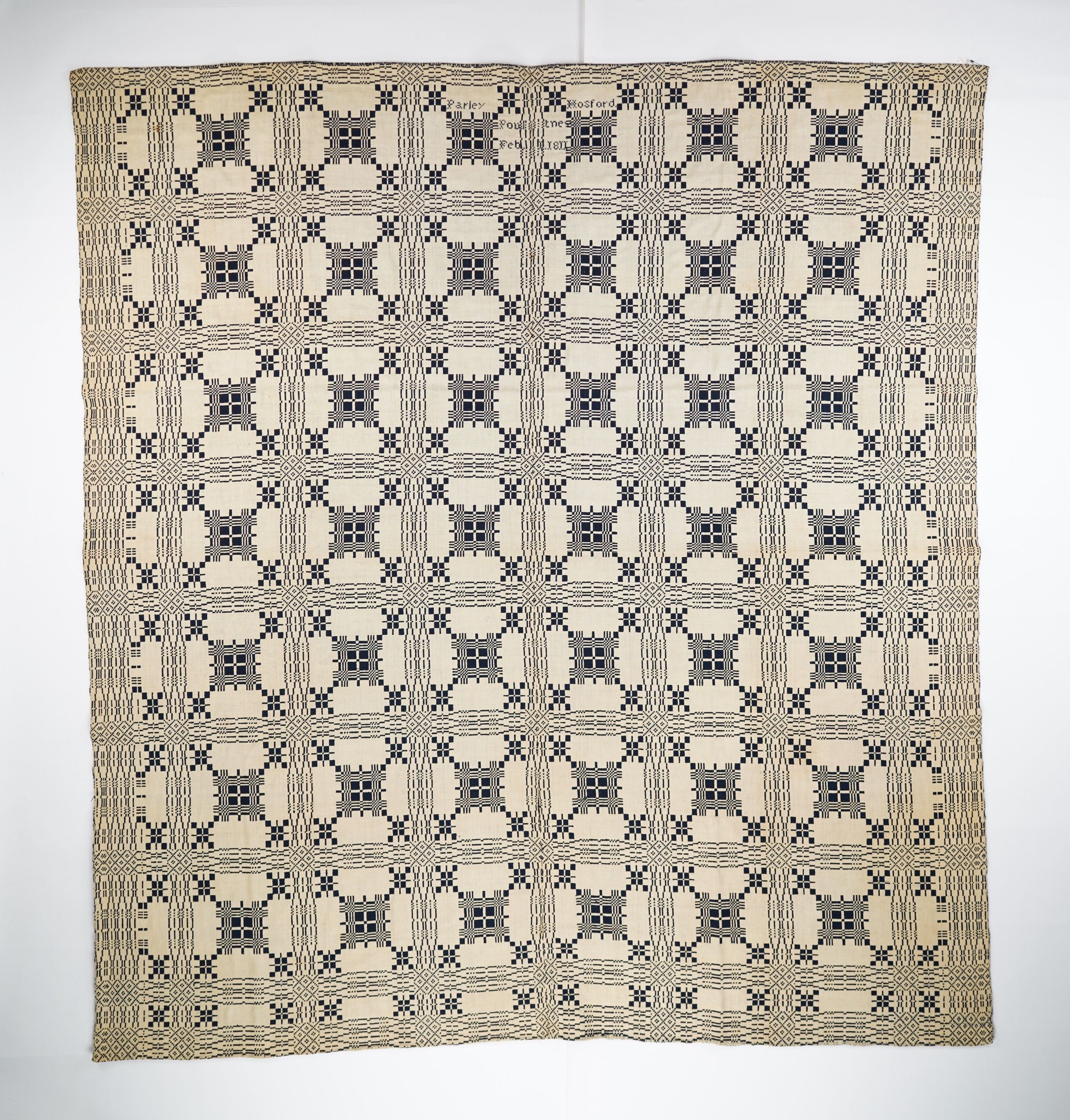 Geometric doubleweave coverlet with borders on 3 sides and no fringe. Two panels joined by a center seam. Navy wool with undyed cotton. Abstract centerfield pattern; abstract border on sides and bottom. Unknown weaver for Parley Hosford in 1811.Context