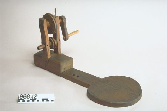Rounded board for operator to sit on in the seat chair. Hand crank and wooden spindle to hold quill. Oil holes at bearings.Collection