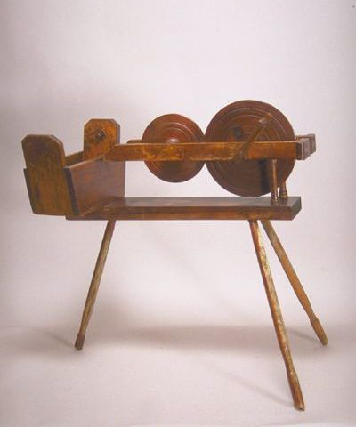 Winder; bobbin, quill, or prin. Rectangular table rests on three splayed legs. a rectangular box is attached to the table end. At the other end two short posts support a three-sided rectangular frame which attaches to the box. The solid drive wheel, with two grooves, fits within the frame on the right. The drive wheel axis rests in holes in the frame with a handle attached on the outside. The accelerating wheel, with two grooves, has an extended hub and fits between the sides of the frame to the left of the wheel drive.Collection