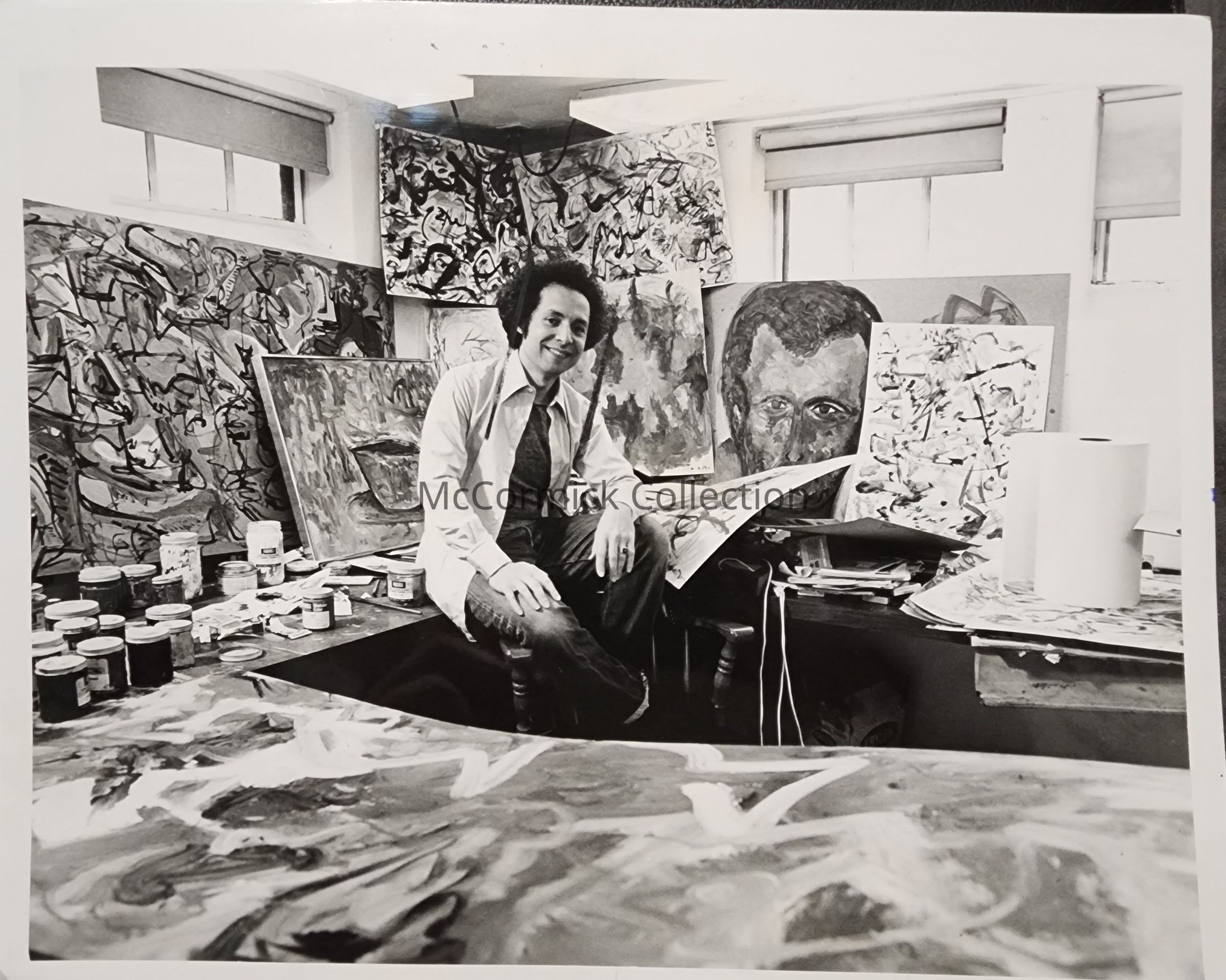 Press photograph of State Senator Jack Faxon posing with his abstract artwork in 1978. Photo by Porter of the Detroit News.