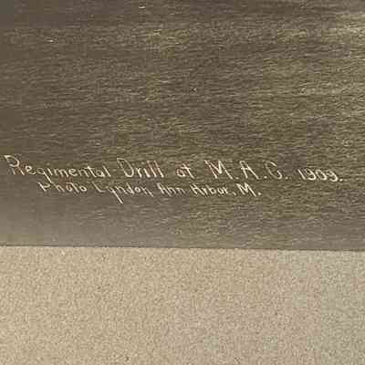 Framed panoramic photograph of the Michigan Agricultural College Regimental Drill on the graded drill field (Landon Field, Adams Field), with Faculty Row in the background. The band is pictured at the far left end in the distance. Photograph by Lyndon of Ann Arbor, 1909.