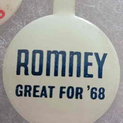 A blue and white tab for George Romney for President in 1968.