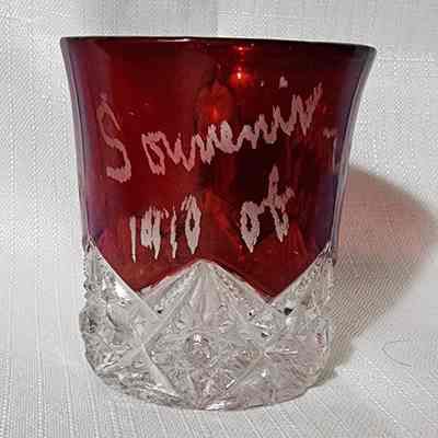 Ruby red flashed glass souvenir cup from Lansing's Waverly Park, belonged to Elmer, and dated 1910.