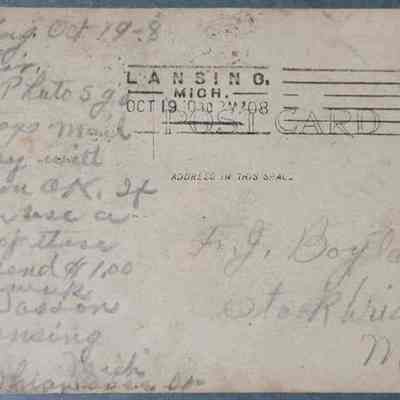 "Lansing, Oct 19-8. Dear Sir, Your photos go by todays mail. Hope they reach you OK. If you can use a dozen of these cards, send $1.00 this week to J.H. Wasson, Lansing, Mich, 610 E. Shiawassee St."