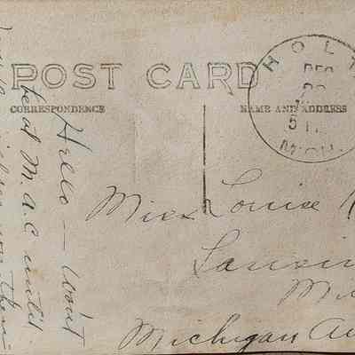 Real photo postcard of downtown Holt, Michigan, of Cedar Street at Holt Road, facing north. An X marks the home of the sender, Florence Thocker (sp). Postally used, Holt postmark.