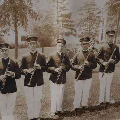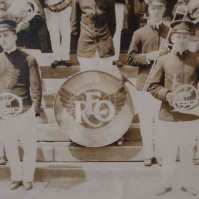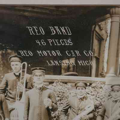 Panoramic photograph of the REO Motor Car Co. Band taken on the steps of the R.E. Olds mansion in Lansing, Michigan. Framed.