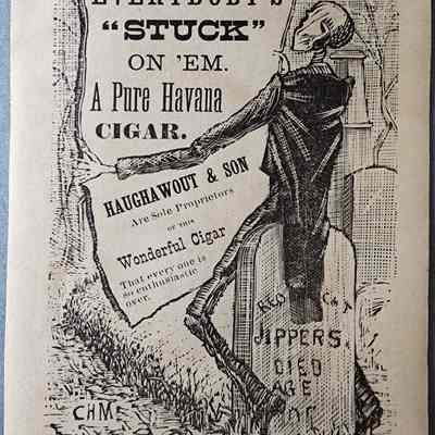 Advertising trade card for Pure Havana, Chas. Haughawout & Son, North Lansing. The back has a CHM, Charles H. Mead, woodcut engraving.