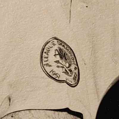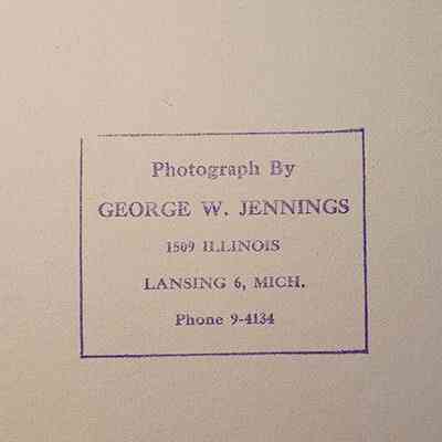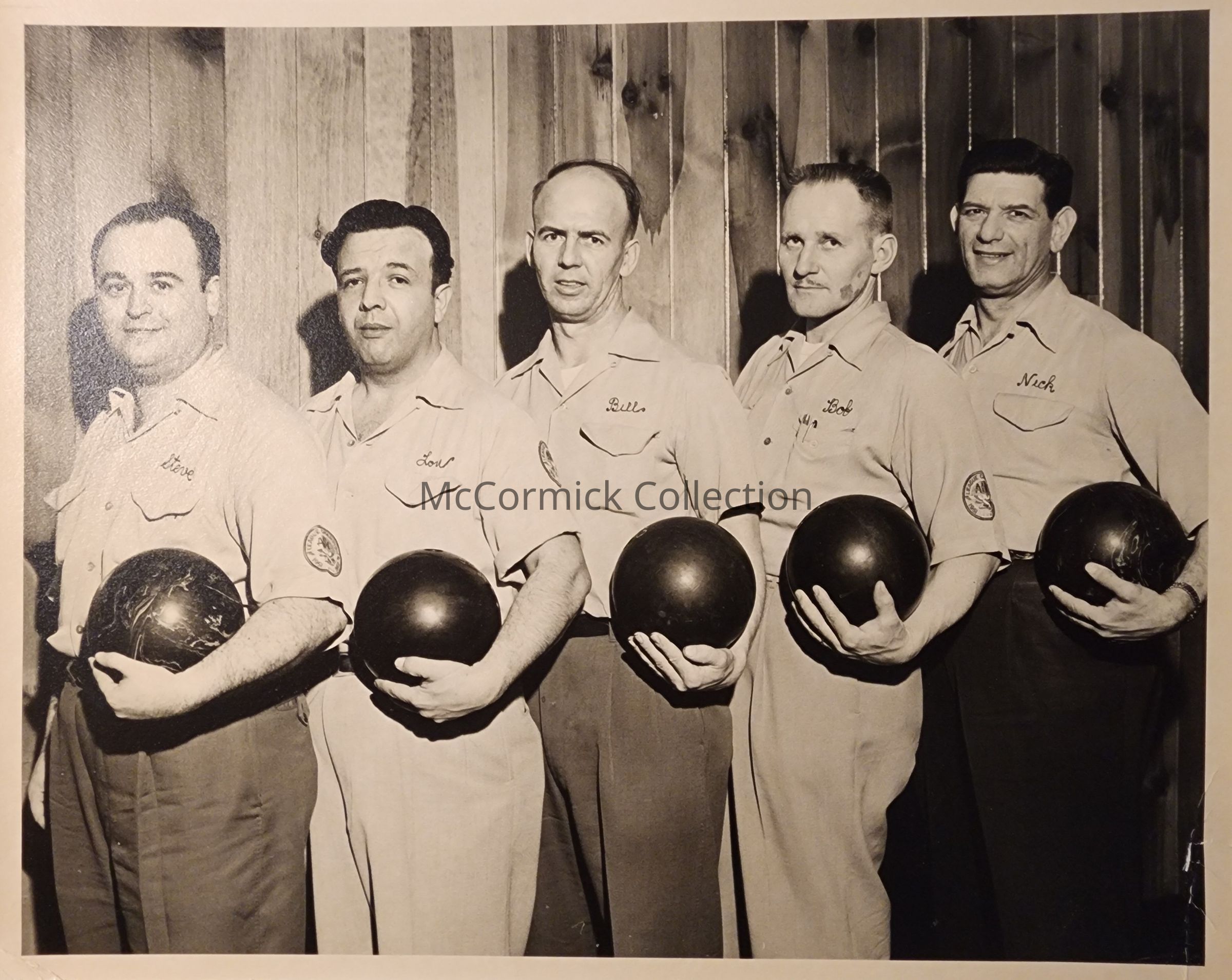 Photographic print of a group of five bowling league members with a 1951 league champions patch. Taken by Lansing photographer George W. Jennings.