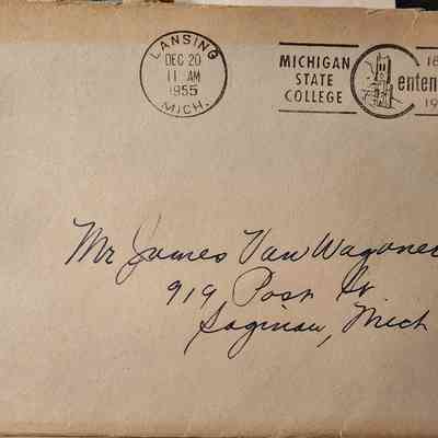 Card addressed to Mr. James VanWagoner, Saginaw, Michigan, from Michigan Attorney General Thomas M. Kavanagh. Envelope has 1955 Michigan State College Centennial cancelation.