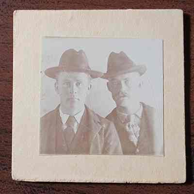 Small card mounted photograph of Joe Hart on left. Though unmarked, likely taken by Penny Photograph Gallery of Lansing.