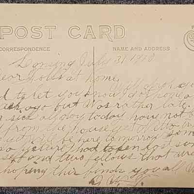 Real photo postcard of three men standing around a table with a young boy standing on the table. There appears to be plaster casts being made. Photo by Lansing photographer Bovee. Long writing on the back which identifies one of the men as DWF and the other two men as his employees, no other details as to the context. Cyko stamp box. Dated July 1910, photo taken Summer 1909.