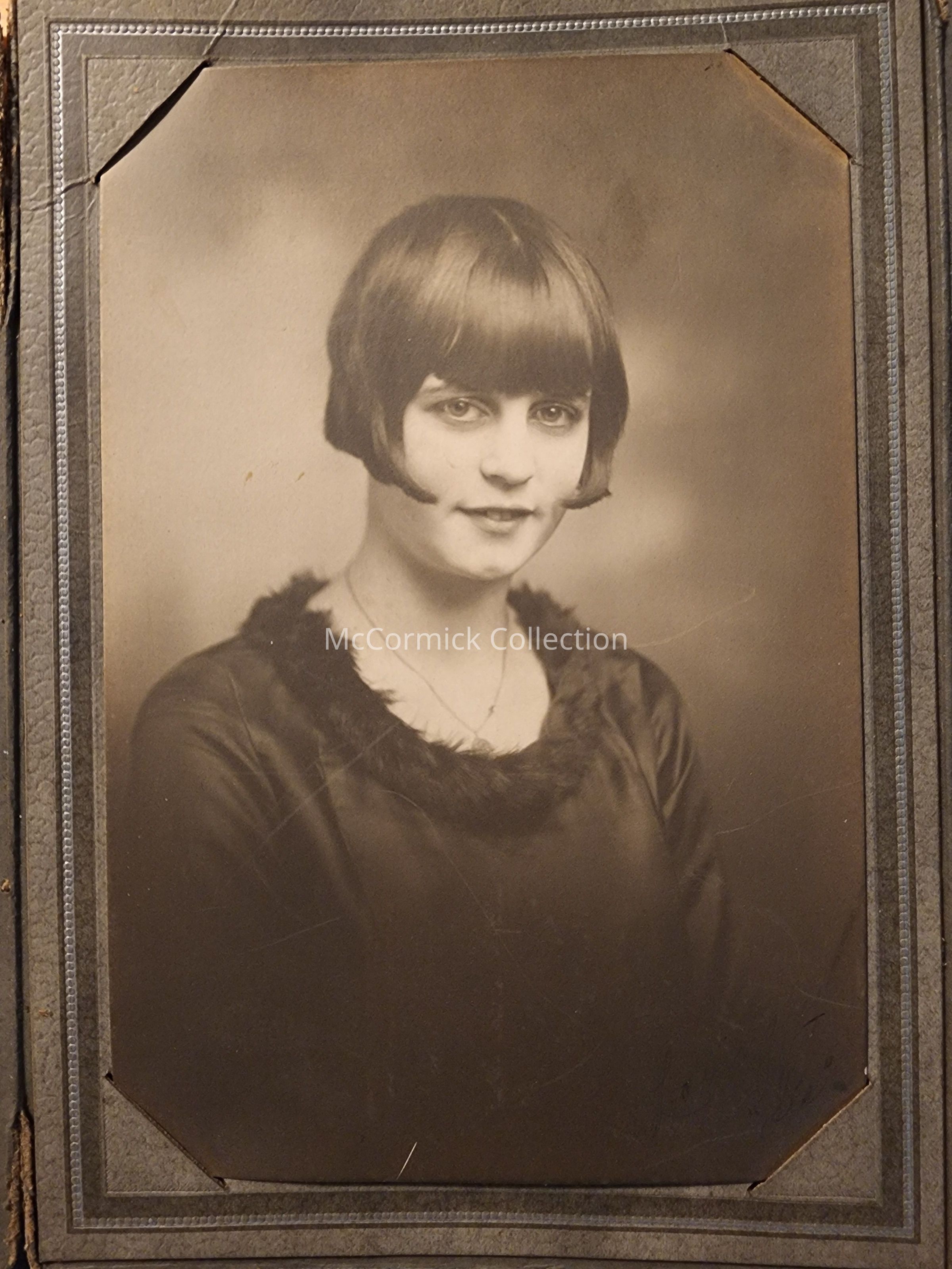 Folder frame mounted photograph of an unidentified woman by Lansing photographer Ellison.