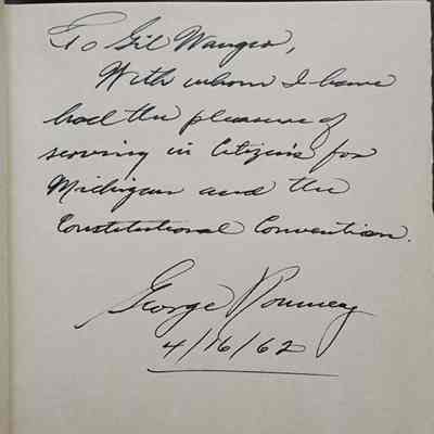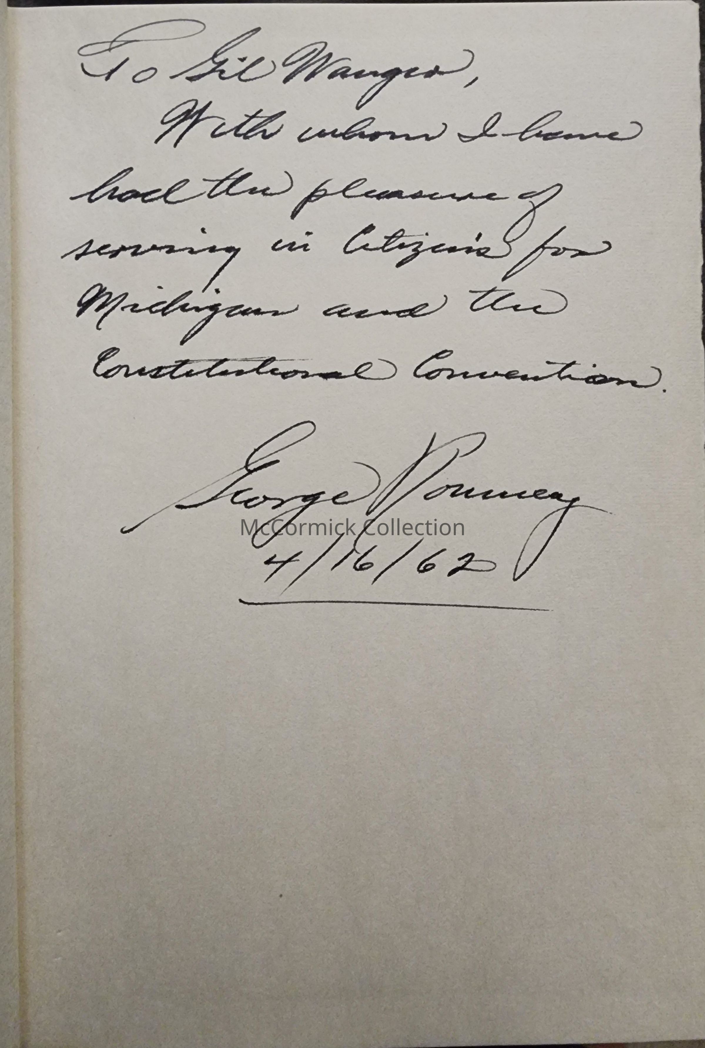 First edition of "The Story of George Romney: Builder, Salesman, Crusader" by Tom Mahoney (1960). This copy belonged to and is inscribed to Gil Wanger, a Lansing delegate to the 1961-1962 Michigan Constitutional Convention, for which Romney was a vice president and Wanger was the youngest Republican Delegate. Wanger is the last surviving Delegate to Con Con.