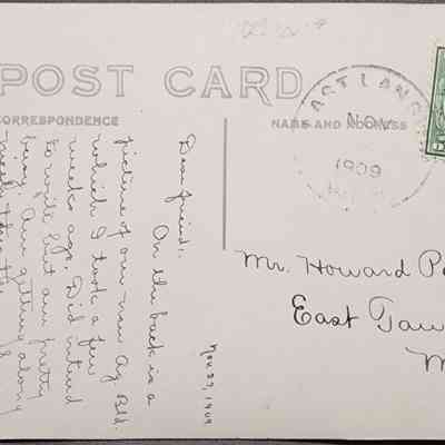 Real photo postcard of the Agricultural Building (Agriculture Hall) at Michigan Agricultural College in East Lansing. Also shows the barns to the south. This is a snapshot photograph postcard and the photographer is unknown. Postmarked 1909.