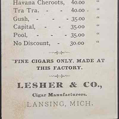 Trade card for Lesher & Co., cigar manufacturers, Lansing, Michigan.
