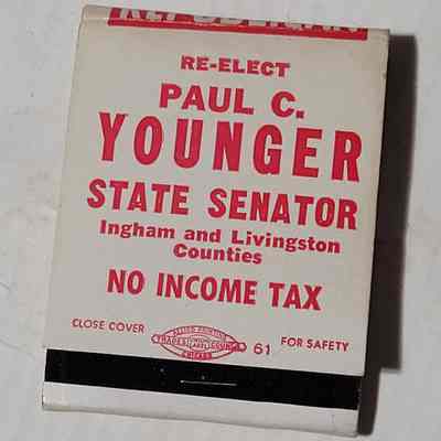 A political matchbook cover for Paul C. Younger for State Senator of Ingham and Livingston Counties, circa 1960s. No Income Tax slogan.