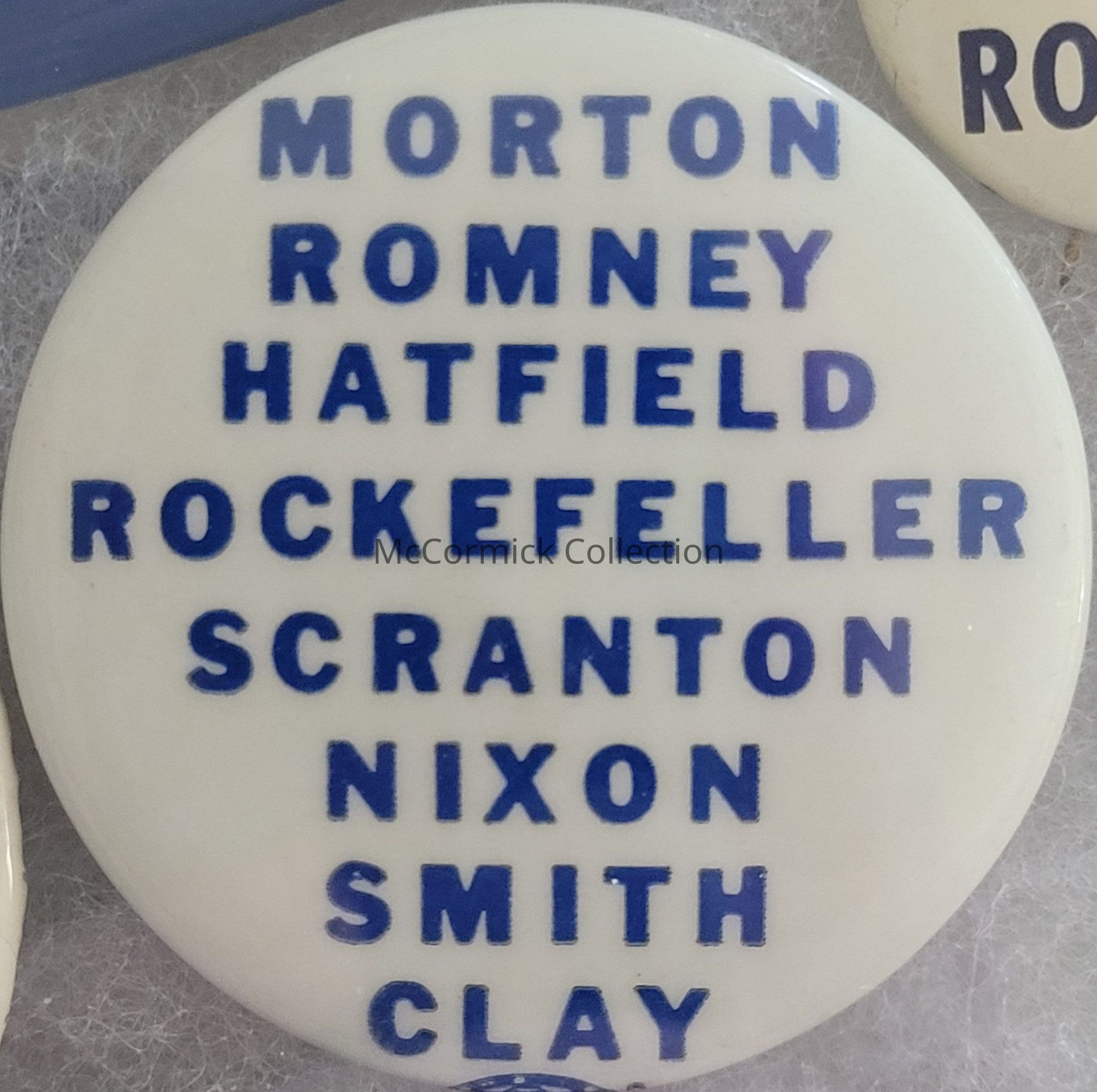 A 1.75" blue and white political button of hopefuls for the 1968 Republican presidential nominations including: Morton, Romney, Hatfield, Rockefeller, Scranton, Nixon, Smith, and Clay. Romney is George Romney of Michigan.