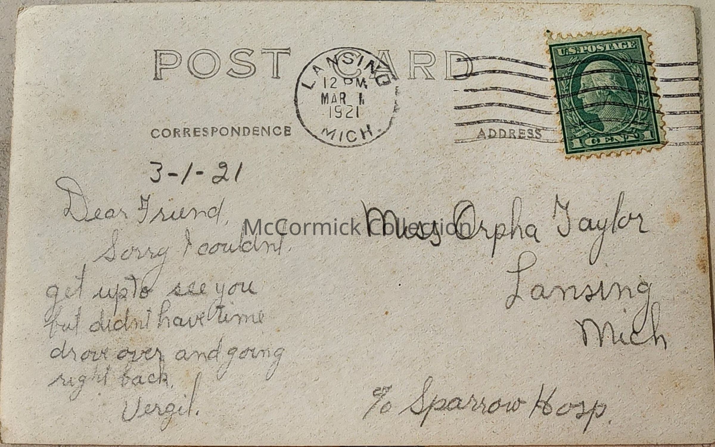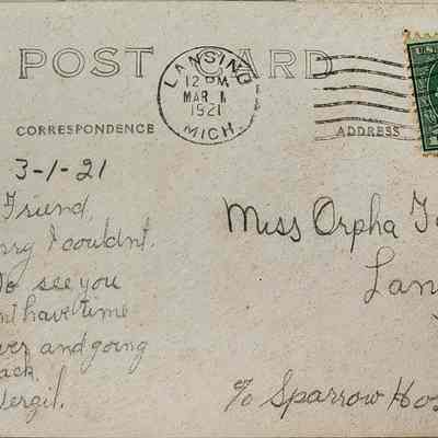 Real photo postcard taken from the dome of the Capitol of downtown Lansing facing southeast. Notable structures visible are the Downey Hotel, Arbaugh's building, and the old Masonic Temple, among many others. Postally used, 1921 Lansing postmark.