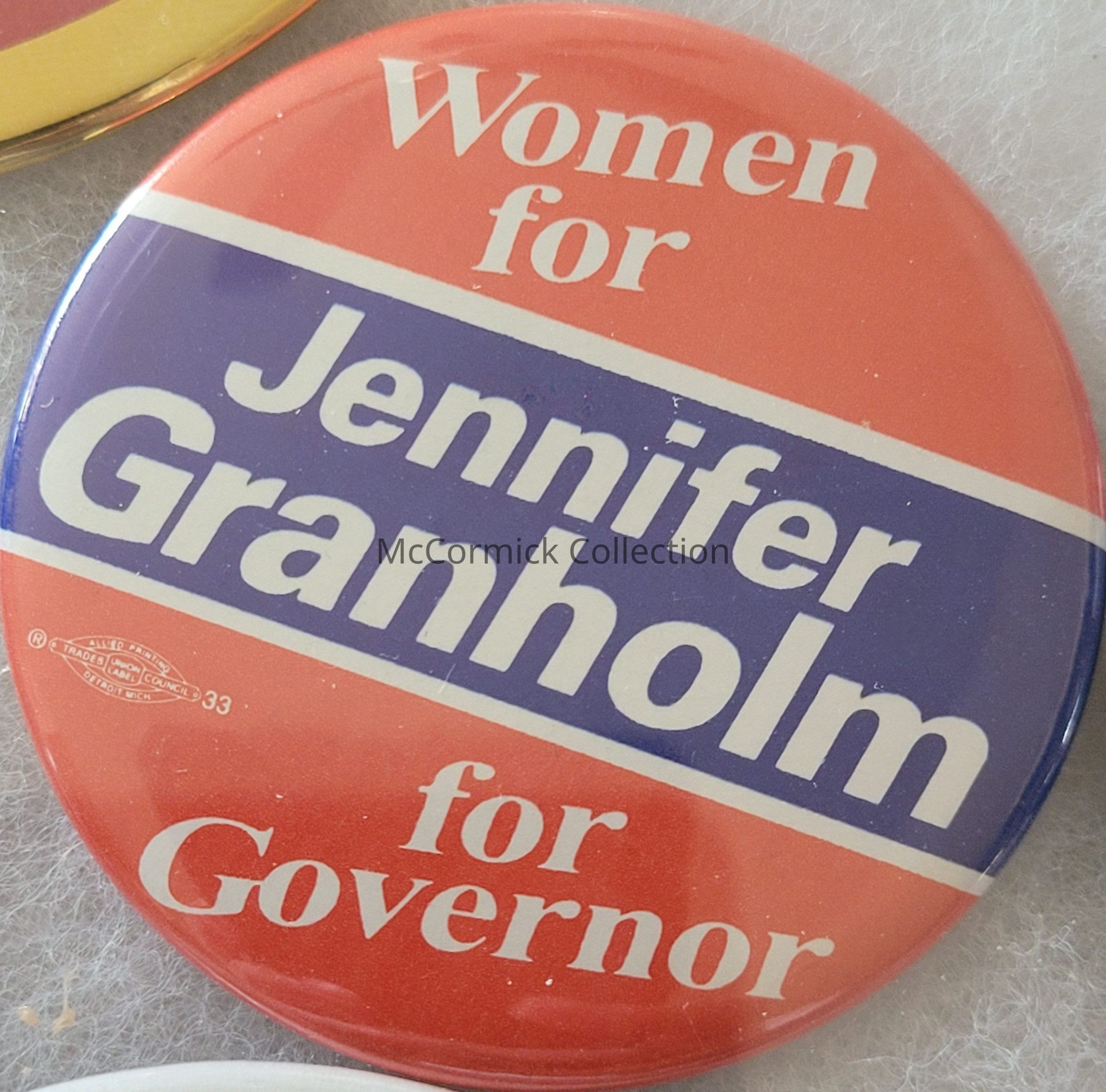 A 2.25" red, white, and blue political button for "Women for Jennifer Granholm for Governor," circa 2002.