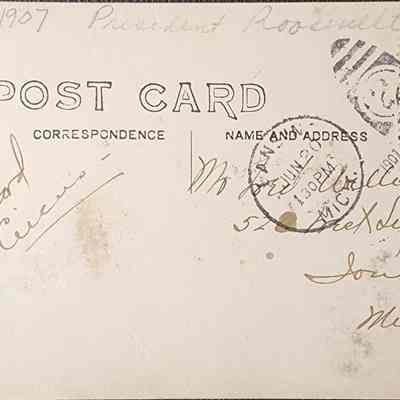 A real photo postcard of a REO automobile driven by R.E. Olds, with President Theodore Roosevelt in the backseat alongside MAC President Johnathan L. Snyder. Roosevelt was in town for the 1907 MAC Semi-Centennial, to deliver the commencement address and hand out diplomas. Postally used with Lansing postmark.