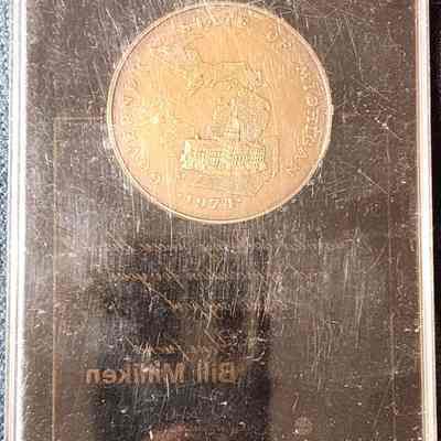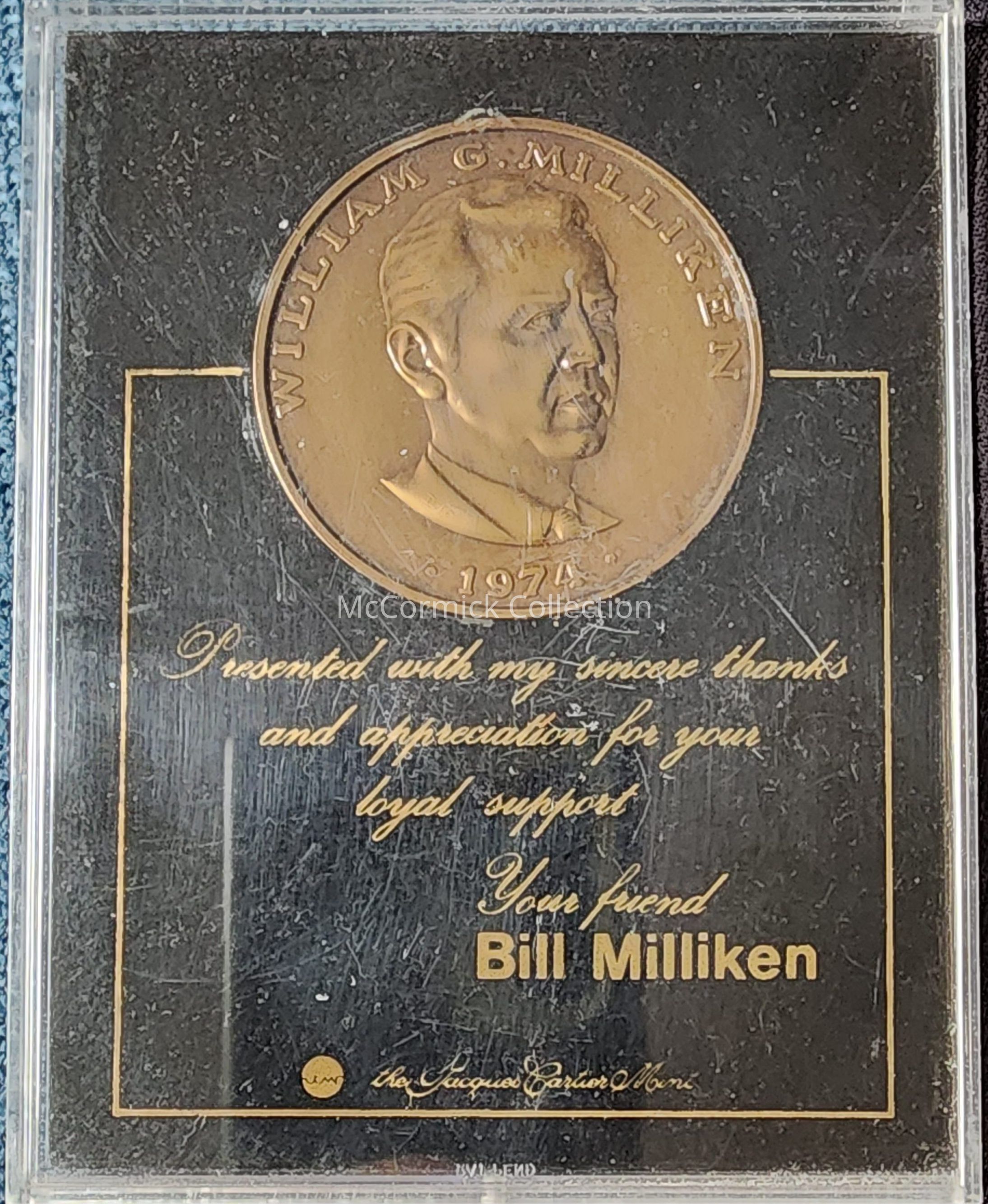 An acrylic case with a 1974 Governor William Milliken Token. The case reads: "Presented with my sincere thanks and appreciation for your loyal support. Your Friend Bill Milliken." Produced by the Jacques Carier Mint.