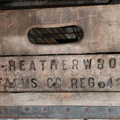 A large wood and metal crate for half pint bottles from Heatherwood Farms dairy in Lansing, Michigan, dated 1942.