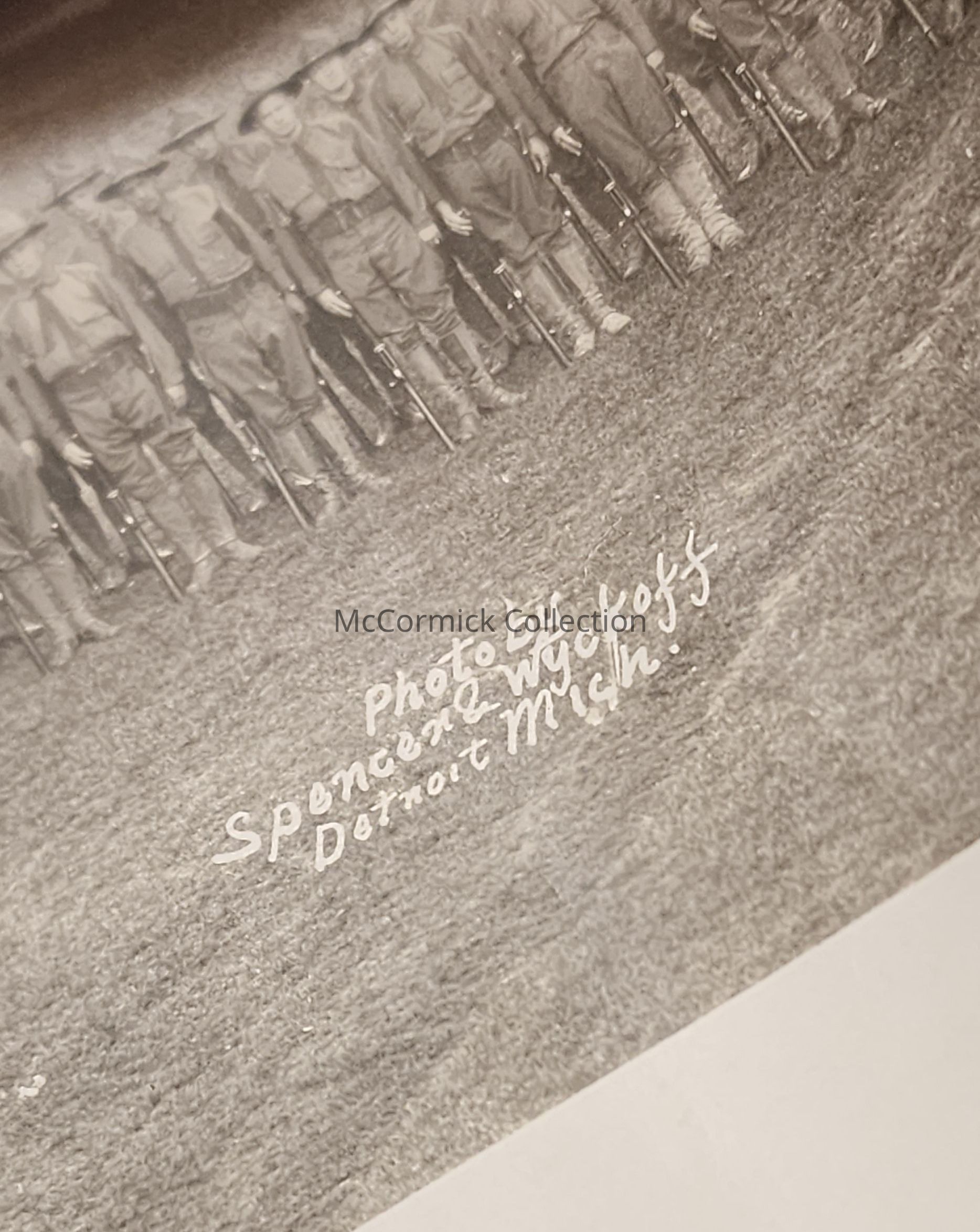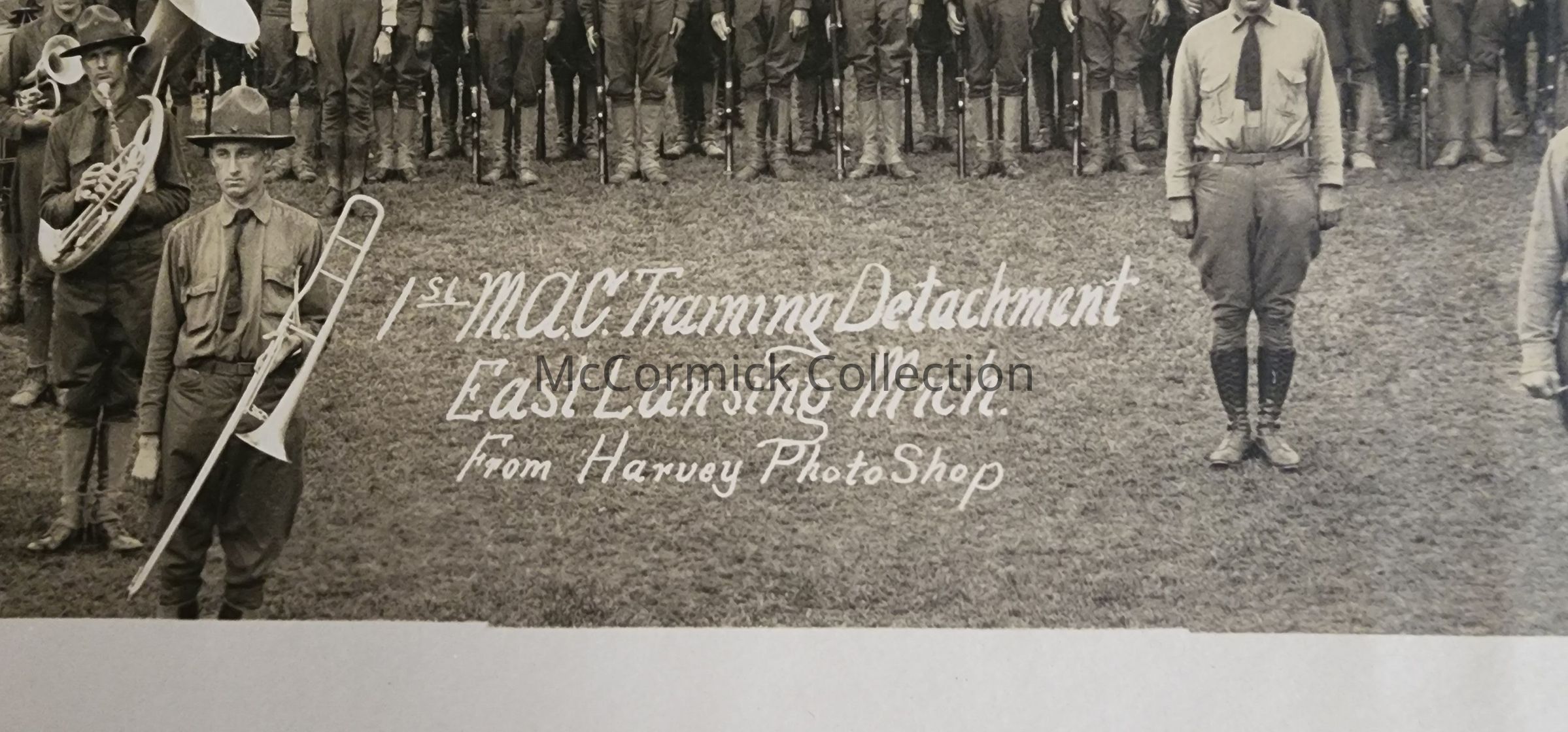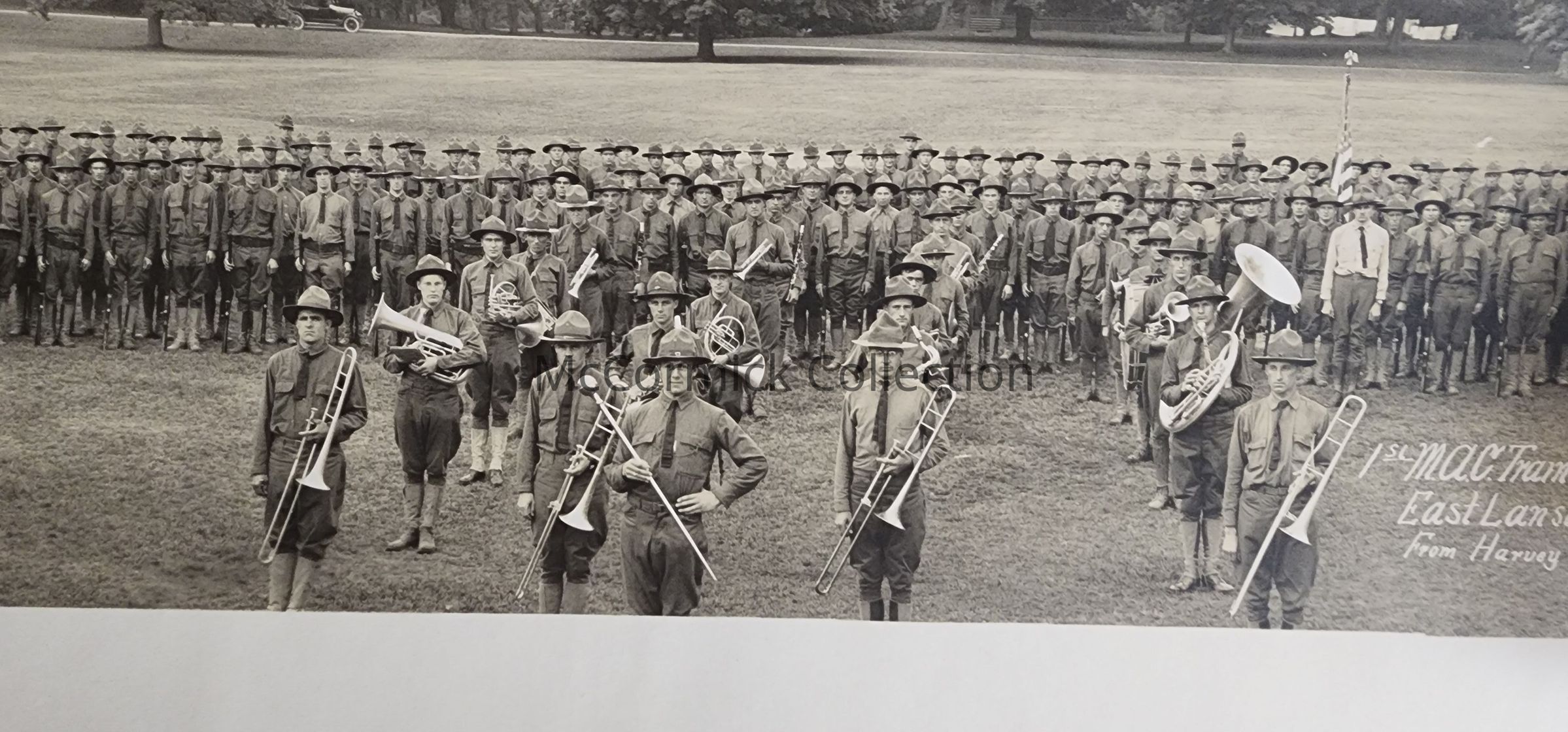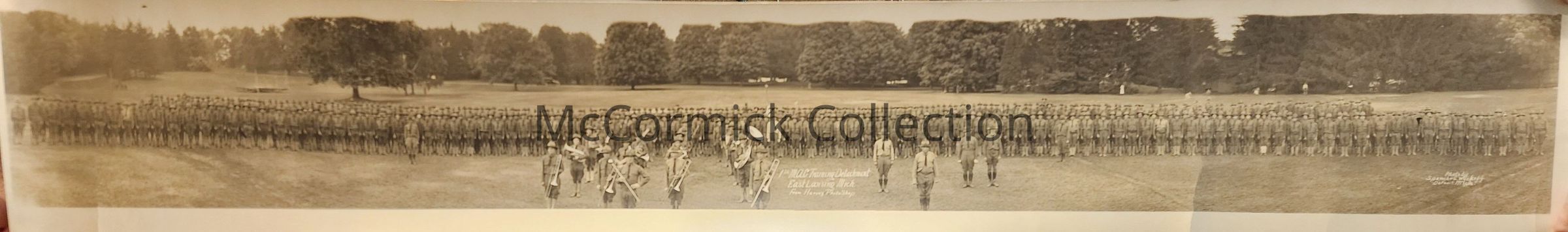 Panoramic photograph of the 2nd Michigan Agricultural College Training Detachment and Band in East Lansing, Michigan. Photo by Harvey Photo Shop in East Lansing, printed by Spencer and Wyckoff of Detroit.
