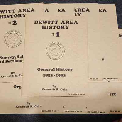 Kenneth Coin's 11-volume DeWitt history booklets, 1982-1983. (1) General History, 1833-1983; (2) Survey, Sale, and Settlement; (3) Establishment of Communities, New Albany, Old DeWitt, Middletown, DeWitt, Gunnisonville; (4) Governmental Center, State, County, Township; (5) Business History; (6) Travel and Communication; (7) Social Organizations; (8) Churches; (9) Schools and Taverns; (10) I. Indians Along the Looking Glass, II. Cemeteries of DeWitt; (11) Town and County Architecture.