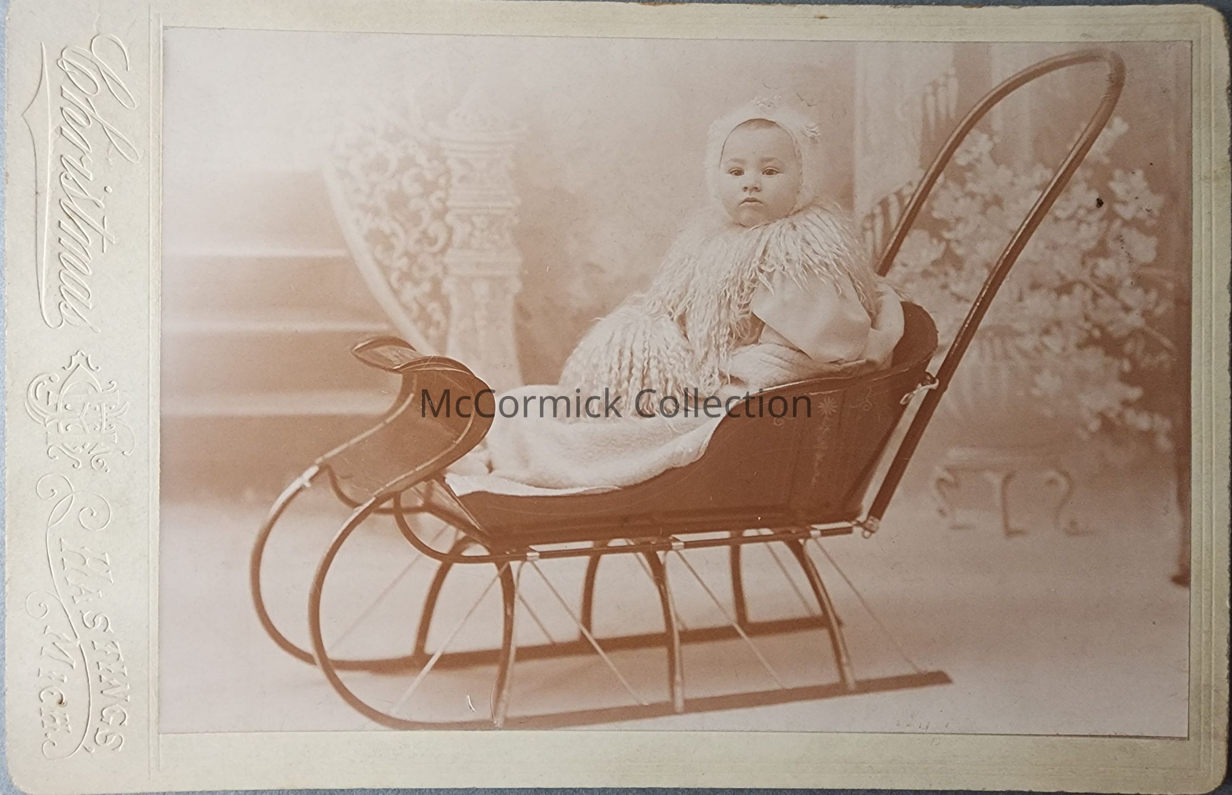Cabinet card photograph of an unidentified child by Christmas of Hastings. Christmas also worked in Lansing.
