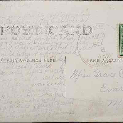 Real photo postcard of a farm. Postally used, 1909 Lake postmark. Addressed to Evart. A long message is written on the back.