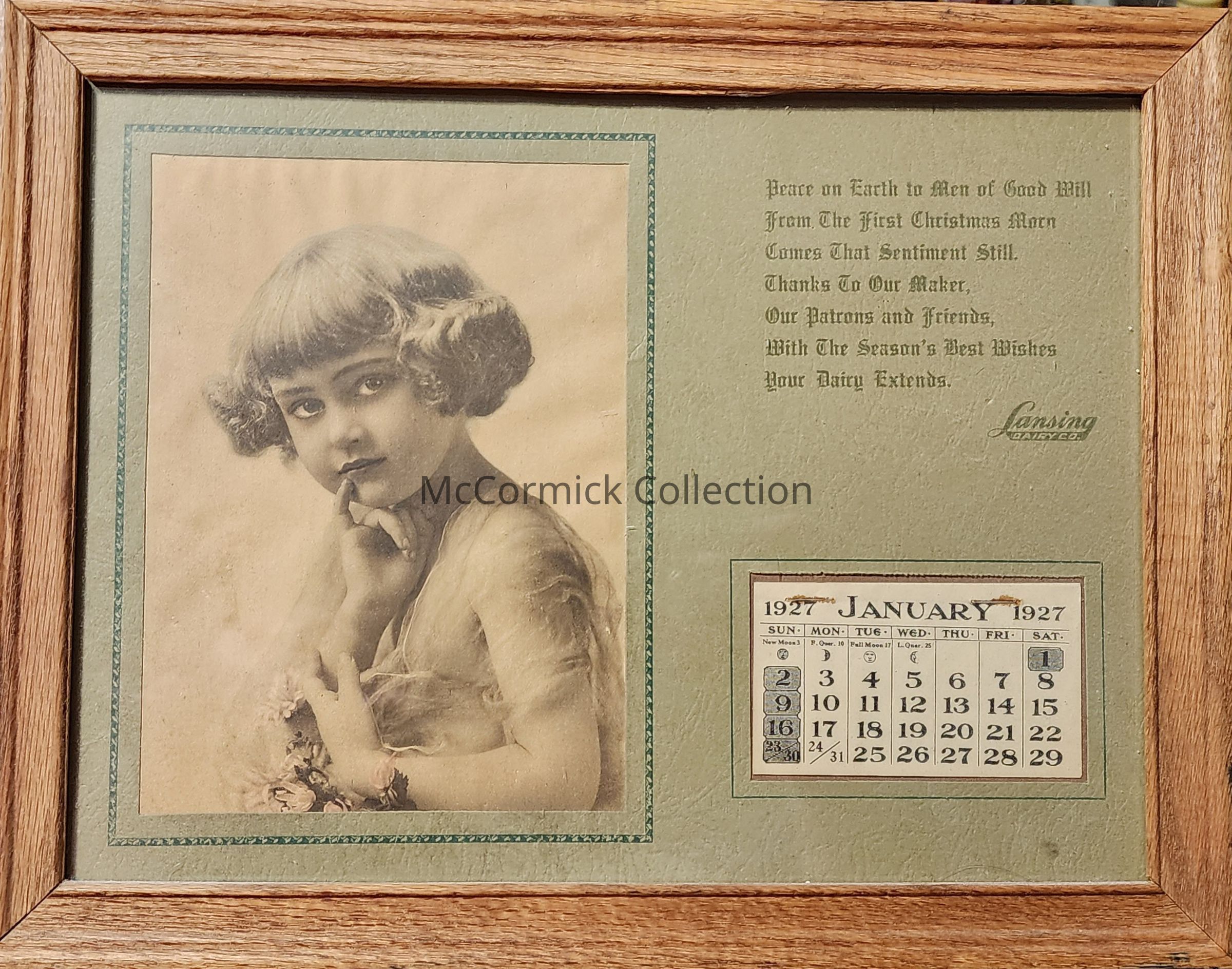 Framed advertising calendar from 1927 of the Lansing Dairy Company.