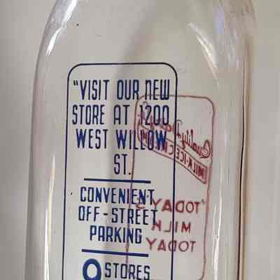 A square quart bottle with red and blue pyro from Quality Dairy Co. of Lansing, Michigan. The back slogan reads: "Visit our new store at 1200 West Willow St. / Convenient Off-Street Parking / 9 Stores in Lansing."