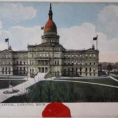 Folder postcard souvenir of Lansing, Michigan, featuring the State Capitol and other buildings and views. Postally unused.