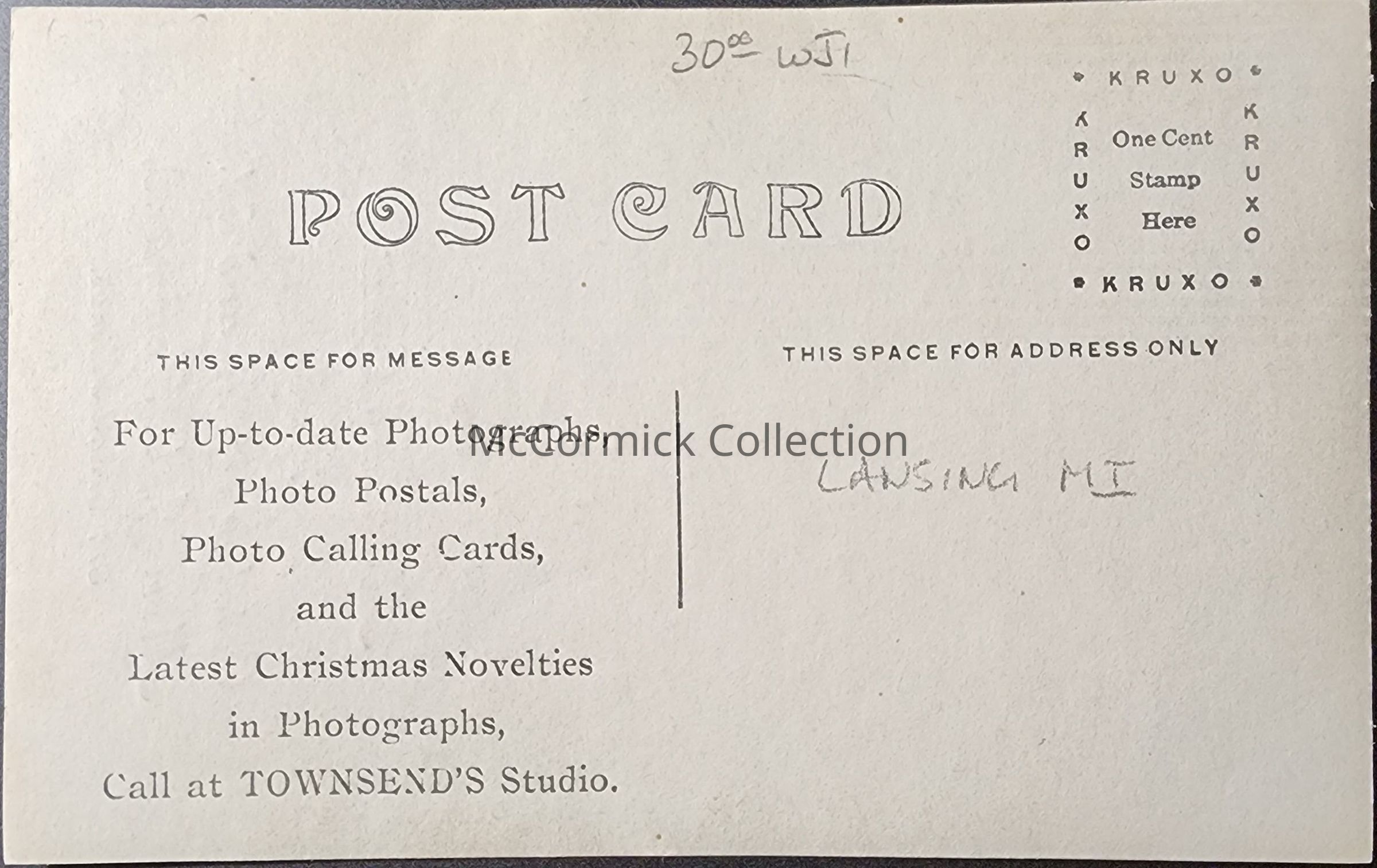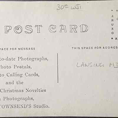 Real photo postcard from Mrs. J.L. Townsend Millinery by the Townsend Studio of Lansing. Postally unused. Studio advertising on the back.