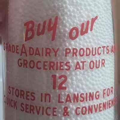 A red pyro half pint bottle from the Quality Dairy Co. of Lansing, Michigan. With 12-store slogan on the back.