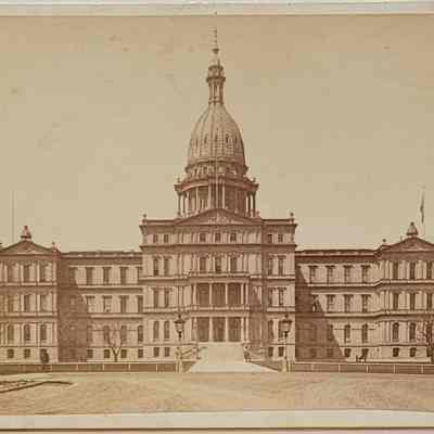 A cabinet card photograph of the Michigan State Capitol taken by Lansing photographer Cassey and Whitney, circa 1884-1887.