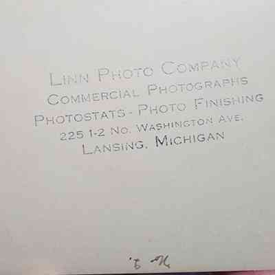 Photographic print of the ruins of the Bath School following the infamous bombing in 1927. This image shows the School building and the crowd of onlookers. Photo by Linn Photo Co. of Lansing, labeled as #7 of a series, the back though numbers it as No. 2.