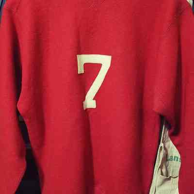 Red wool sweater, made by Spalding, circa 1940s. "Lansing" is emblazoned on the front with the number 7 of the back. Other than a few small moth holes, the sweater is in good condition.
